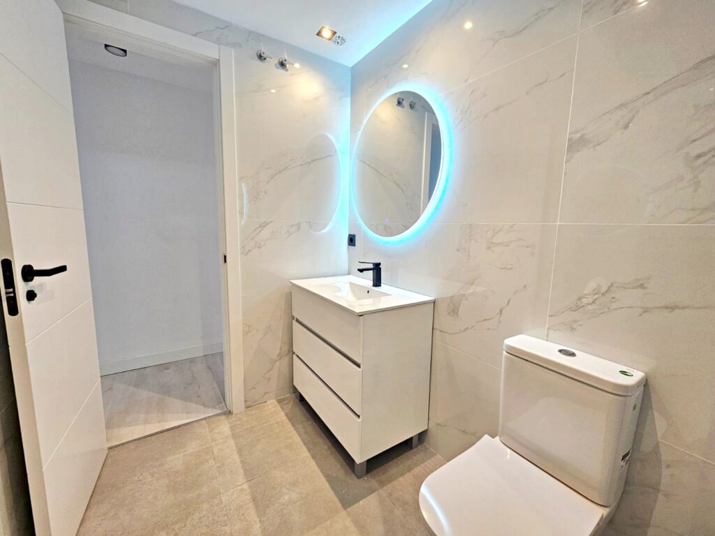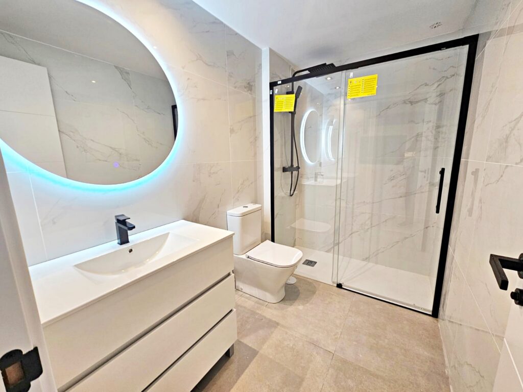 Aire acondicionado centralizado por conductos, cuartos de baño con platos de ducha, mamparas, muebles de lavabo, espejos iluminados led.