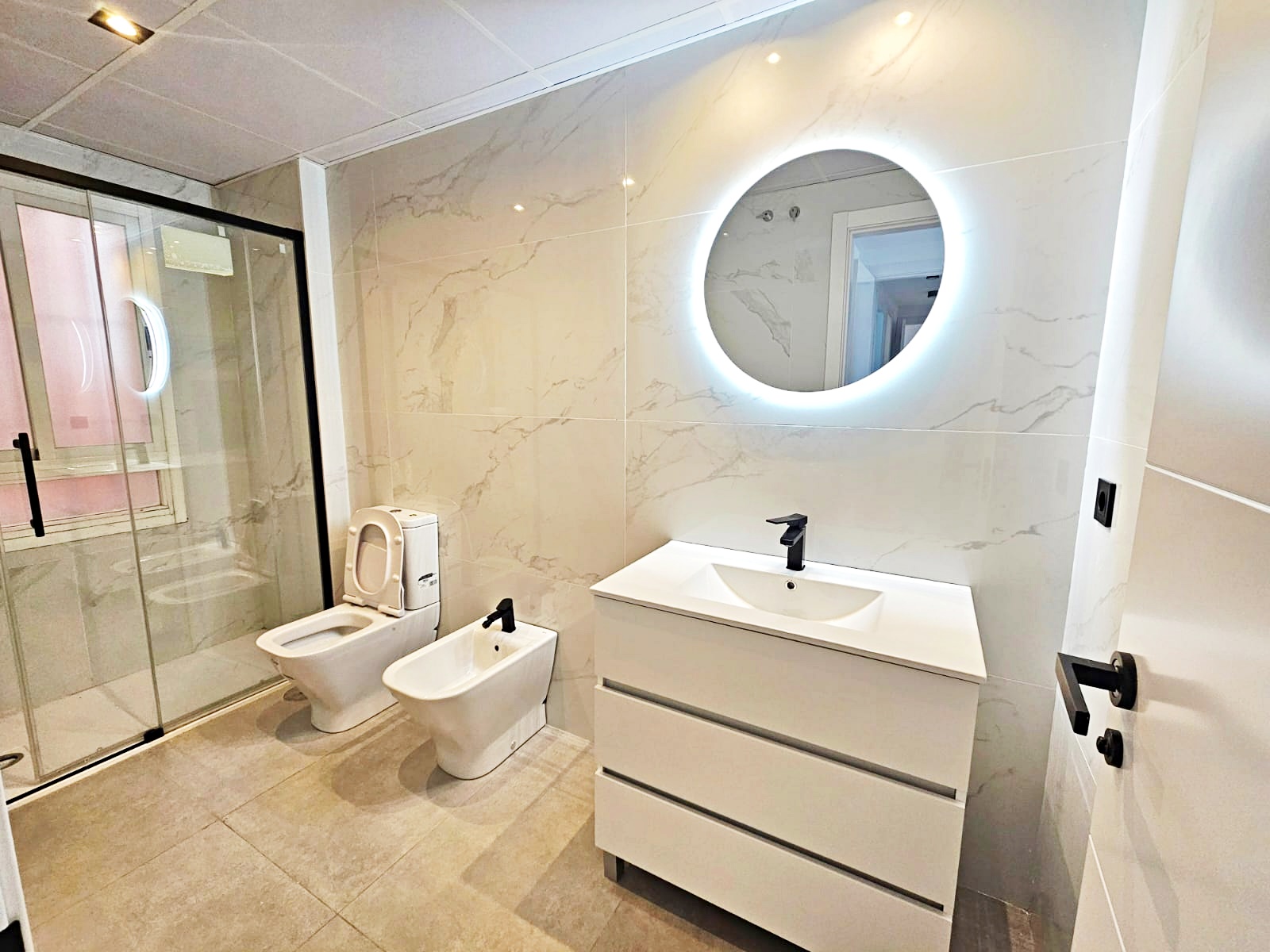 Aire acondicionado centralizado por conductos, cuartos de baño con platos de ducha, mamparas, muebles de lavabo, espejos iluminados led.